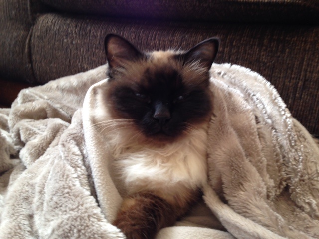 When I’m away, my house mate unfolds the blankie and lays it on the sofa so the cats can pick up my scent and find some comfort during my absence. They all knead and purr and pour over it.