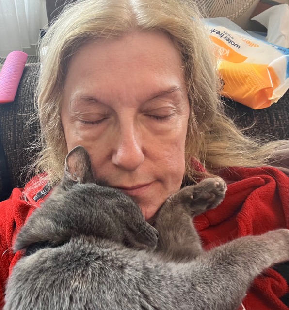 In the meantime, my littlest cat has just thrown herself at me and is lying across my chest and purring into my face. She’s a sweet, soft weight, her body totally relaxed and melted over my Covid heated corpse.